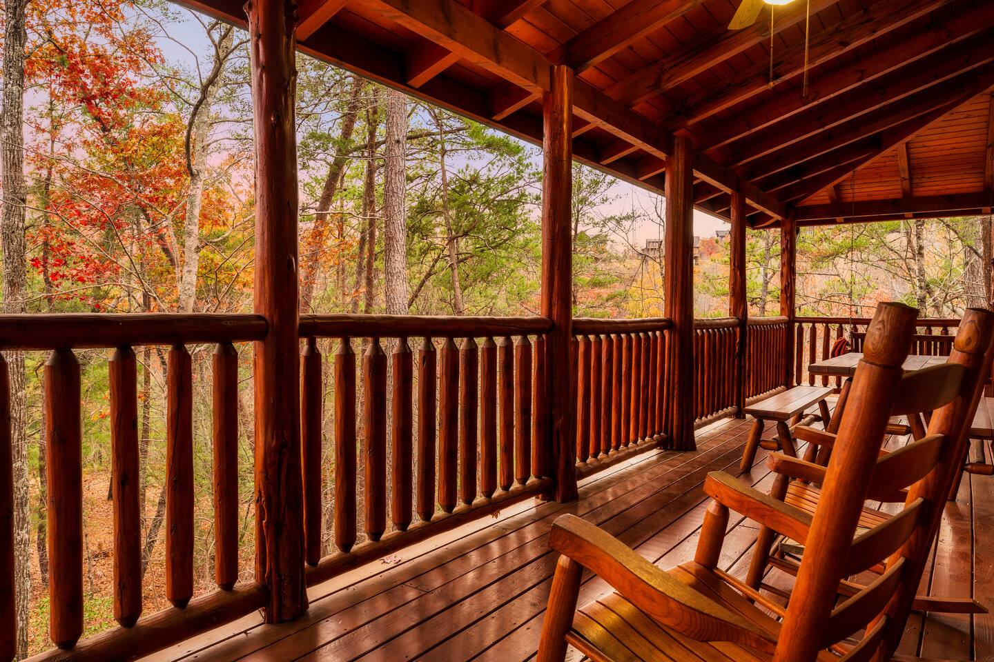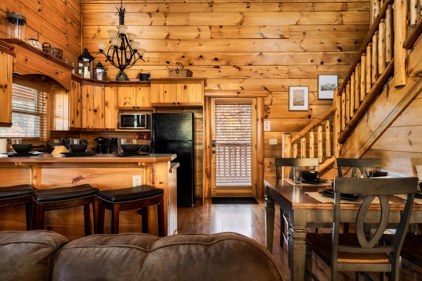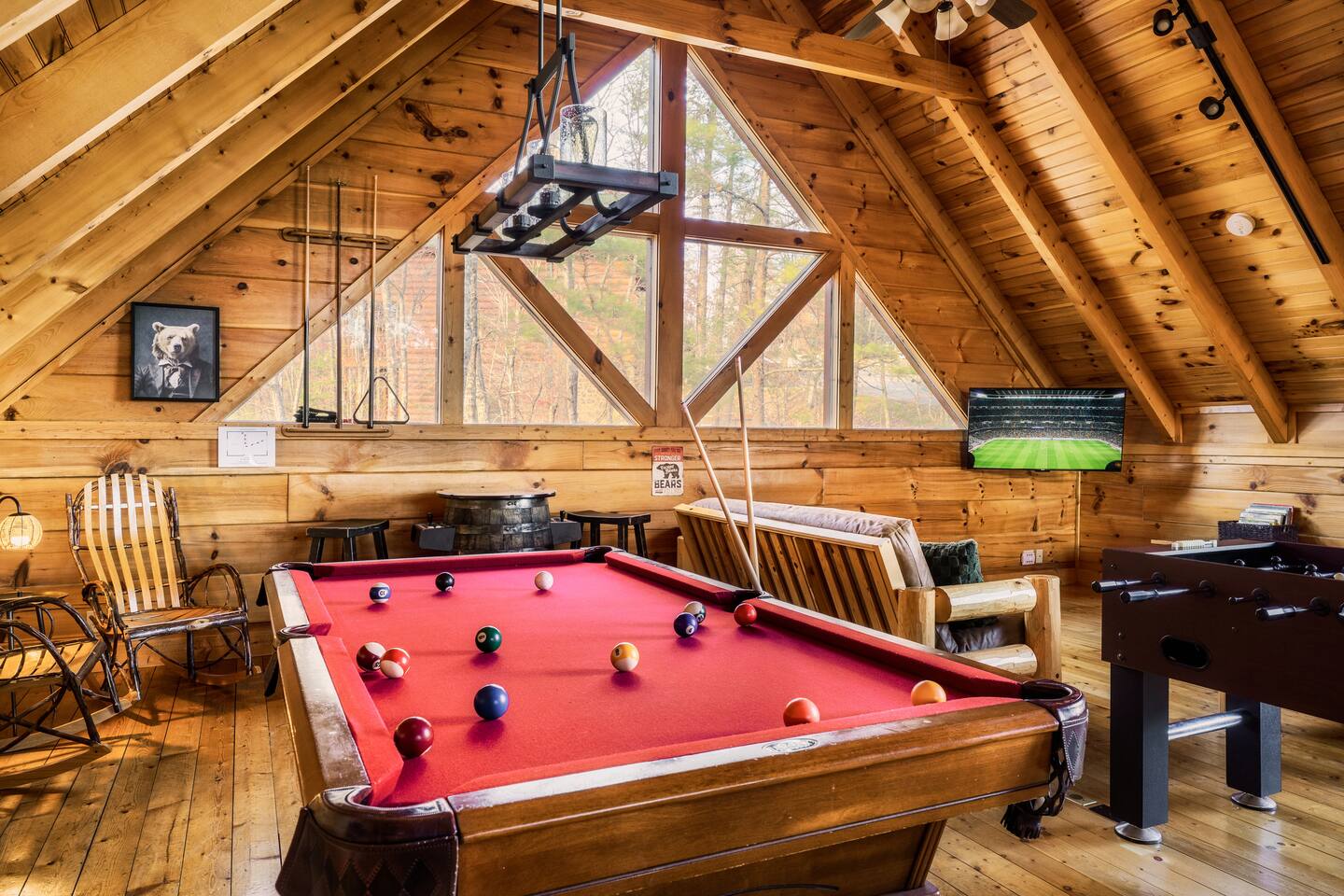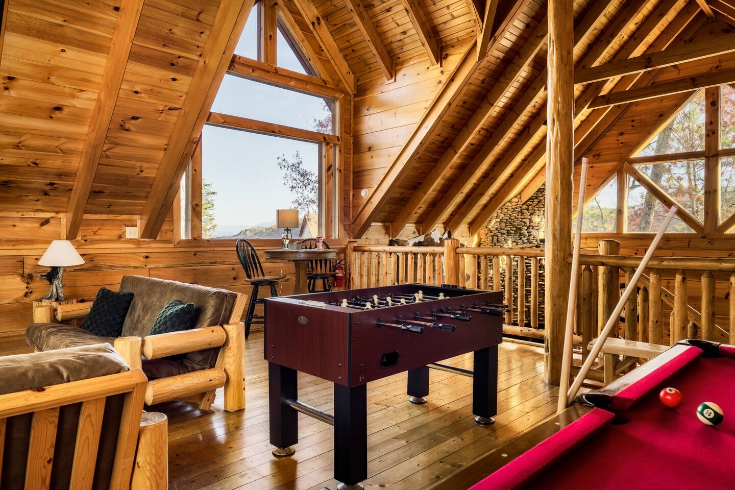 -Family room with stone fireplace -Fully Stocked Kitchen Including: Various Cookware like pots/pans Can opener Measuring cups Pitchers Spatulas and cooking utensils Silverware Toaster Crock Pot Drip Coffee Pot and Keurig Tea Kettle Several sets of dishes Grilling tools Cutting board Knife Set -Dining and bar seating for 8 -2 king bedrooms on main floor -2 full bathrooms with linens -Upstairs large loft with game room and additional sleeping and sitting area. -Bluetooth speaker to stream your music -High-speed wifi plus 4 TVs in cabin -Beautiful views from wrap-around porch -Porch swing and porch picnic table -Lots of rocking chairs on porches -Resort neighborhood has outdoor pool, and picnic area