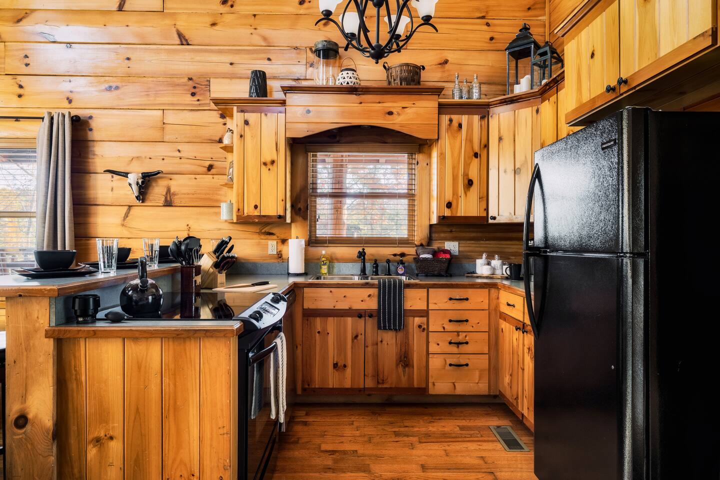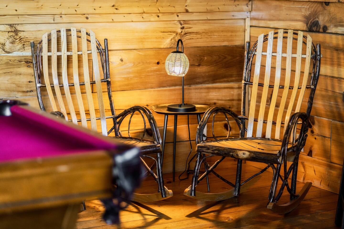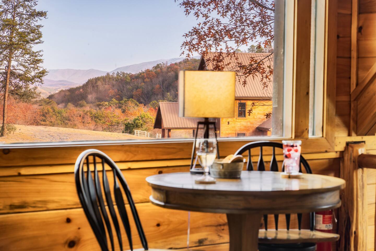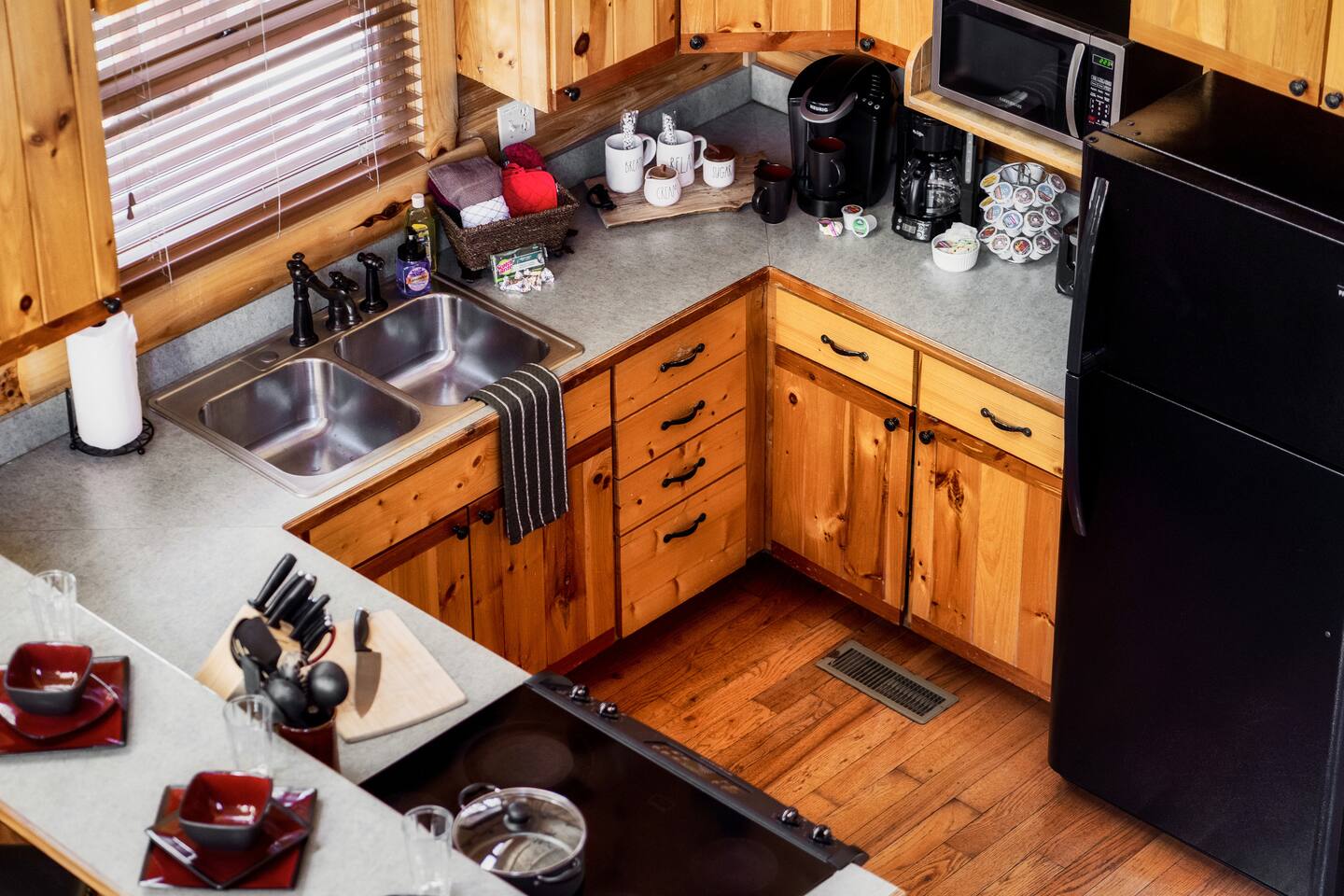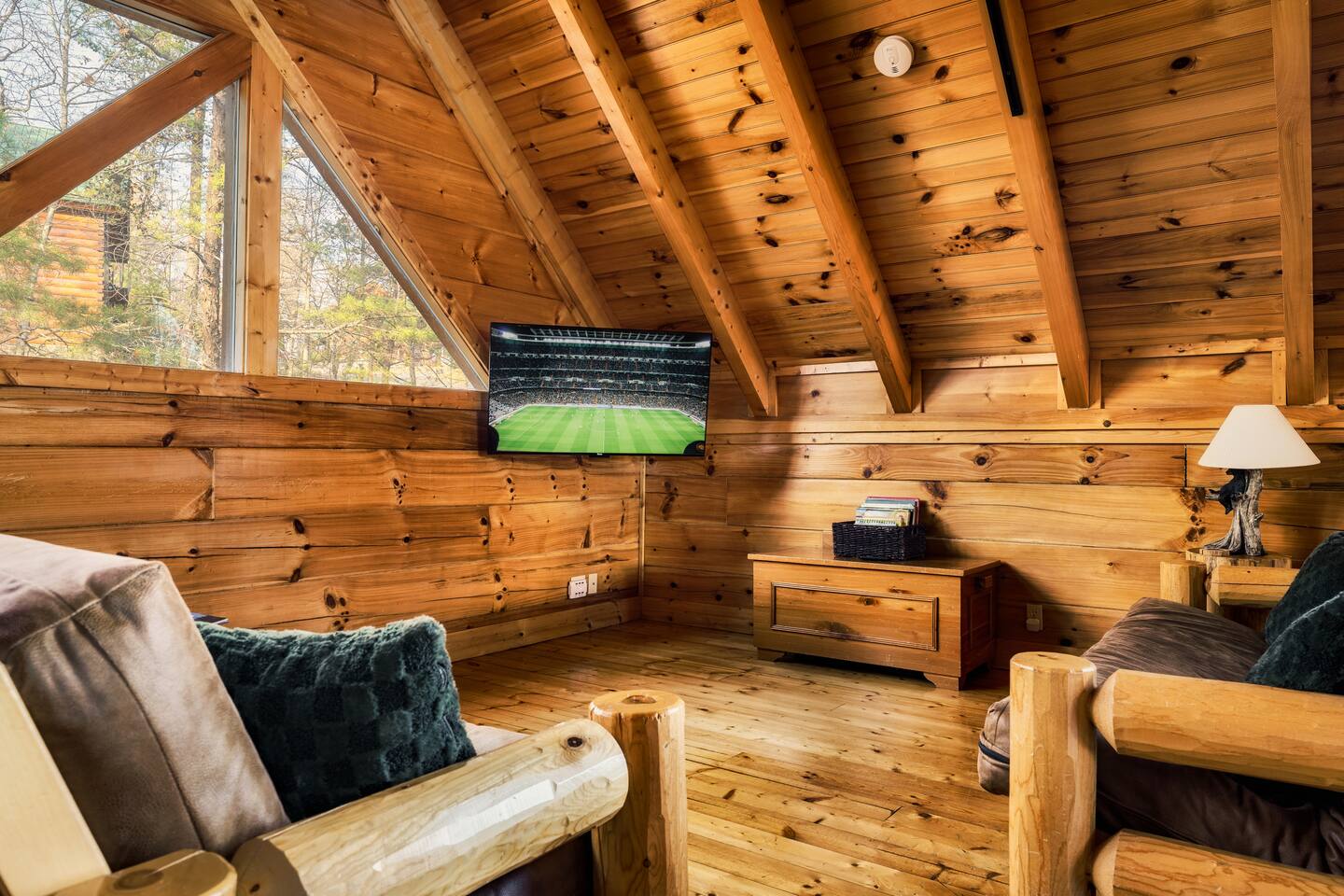 -Family room with stone fireplace -Fully Stocked Kitchen Including: Various Cookware like pots/pans Can opener Measuring cups Pitchers Spatulas and cooking utensils Silverware Toaster Crock Pot Drip Coffee Pot and Keurig Tea Kettle Several sets of dishes Grilling tools Cutting board Knife Set -Dining and bar seating for 8 -2 king bedrooms on main floor -2 full bathrooms with linens -Upstairs large loft with game room and additional sleeping and sitting area. -Bluetooth speaker to stream your music -High-speed wifi plus 4 TVs in cabin -Beautiful views from wrap-around porch -Porch swing and porch picnic table -Lots of rocking chairs on porches -Resort neighborhood has outdoor pool, and picnic area