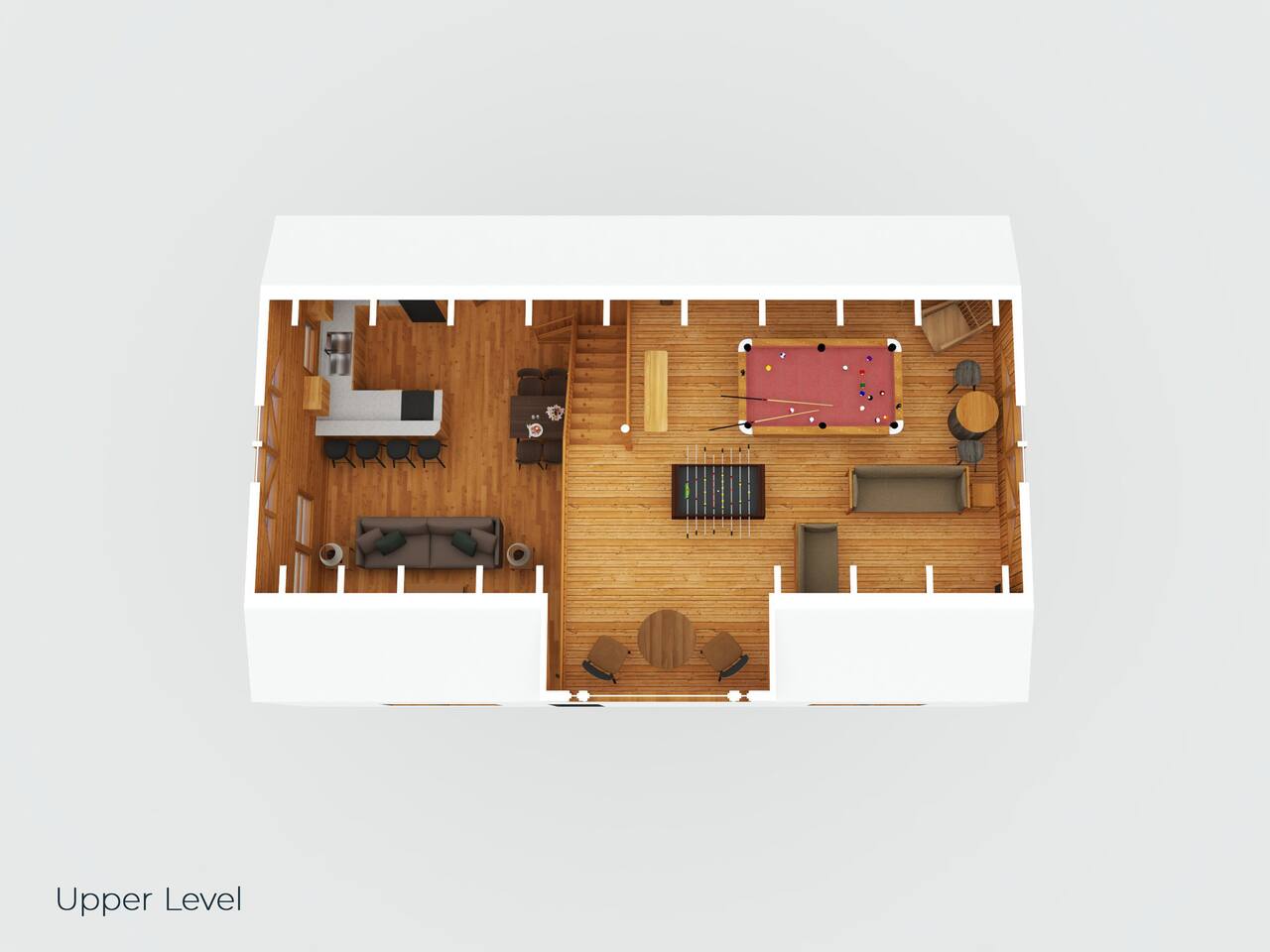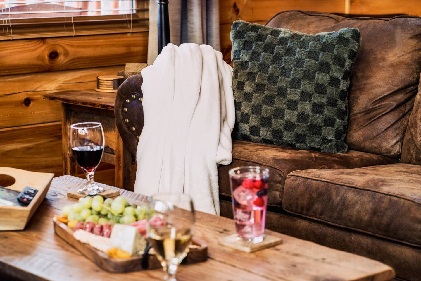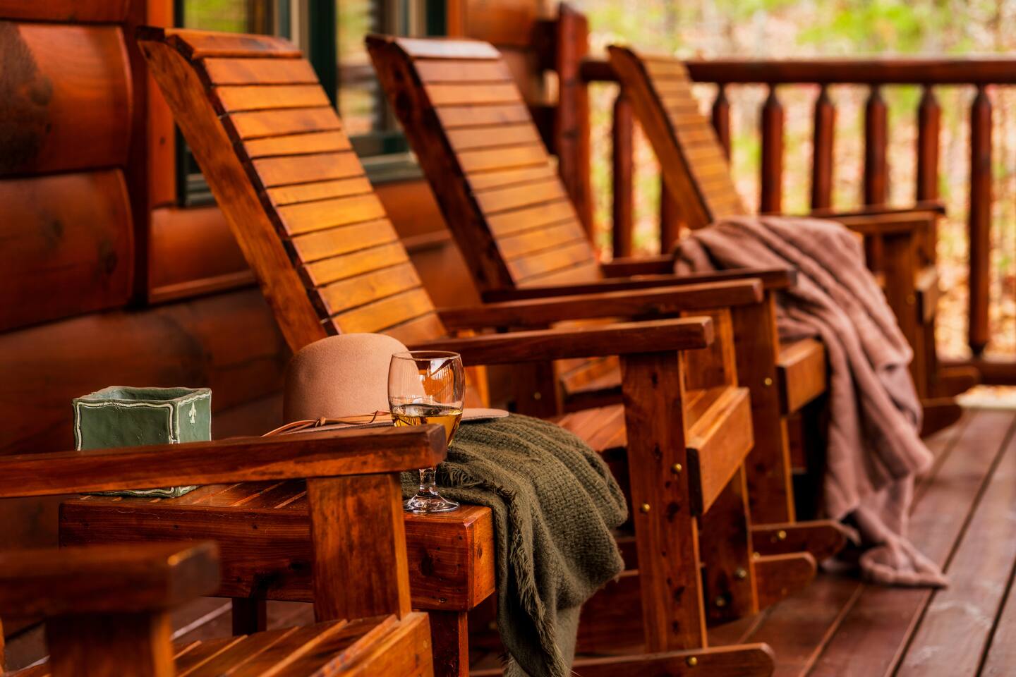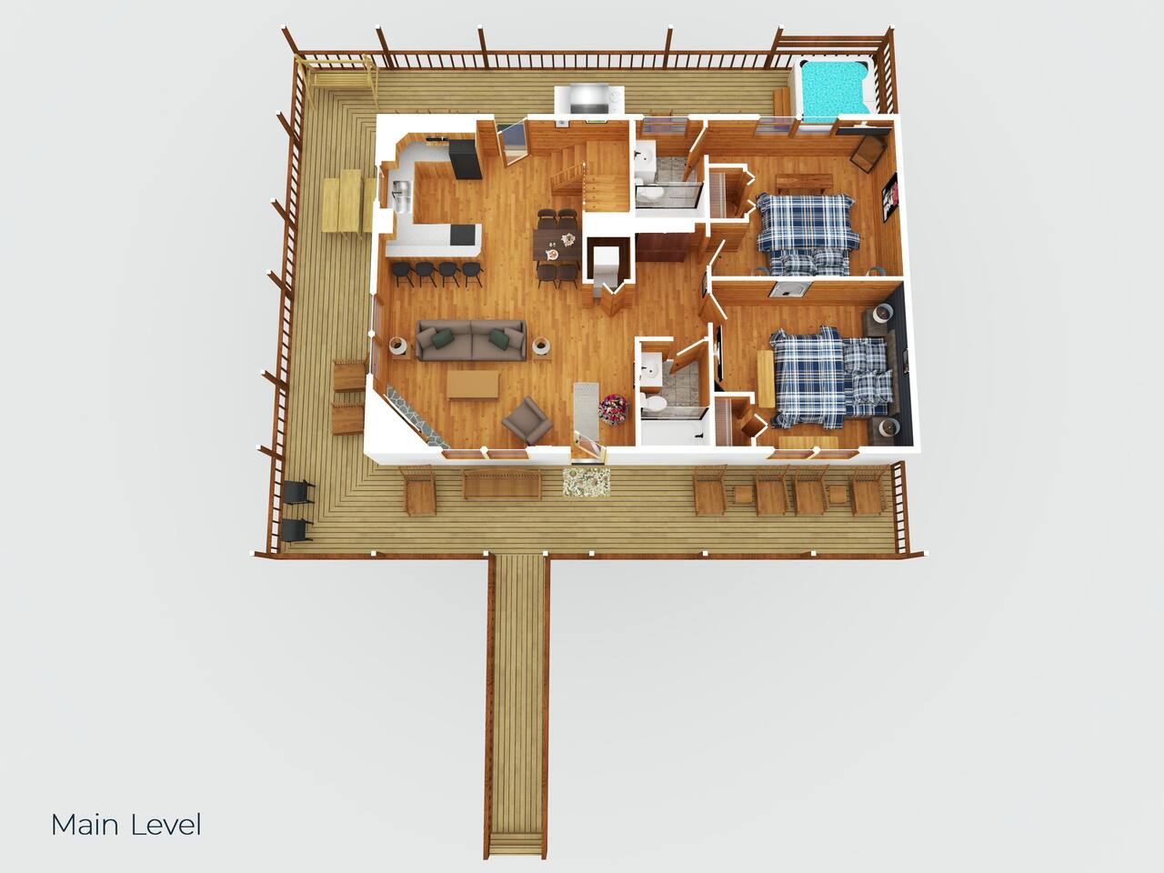 -Family room with stone fireplace -Fully Stocked Kitchen Including: Various Cookware like pots/pans Can opener Measuring cups Pitchers Spatulas and cooking utensils Silverware Toaster Crock Pot Drip Coffee Pot and Keurig Tea Kettle Several sets of dishes Grilling tools Cutting board Knife Set -Dining and bar seating for 8 -2 king bedrooms on main floor -2 full bathrooms with linens -Upstairs large loft with game room and additional sleeping and sitting area. -Bluetooth speaker to stream your music -High-speed wifi plus 4 TVs in cabin -Beautiful views from wrap-around porch -Porch swing and porch picnic table -Lots of rocking chairs on porches -Resort neighborhood has outdoor pool, and picnic area