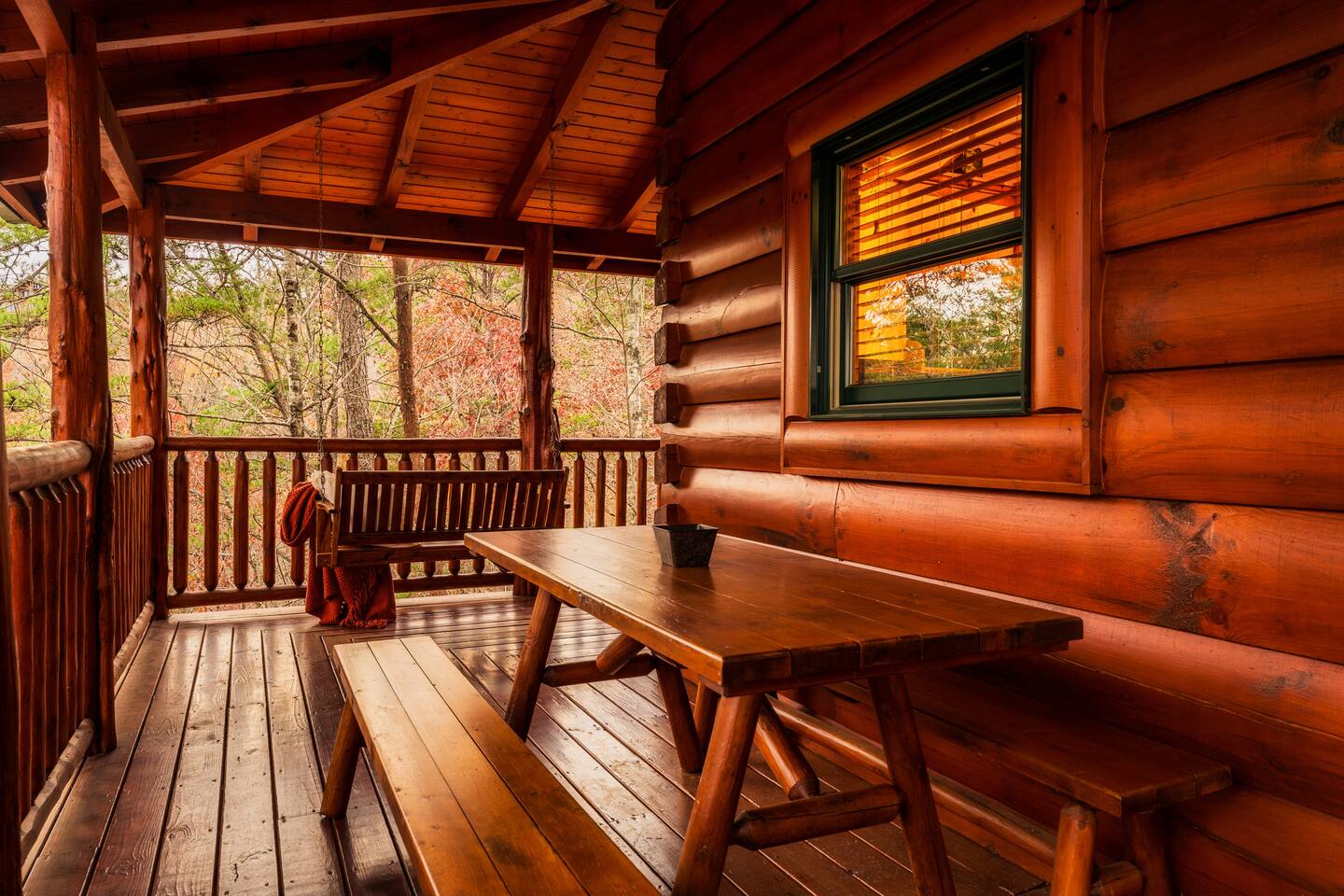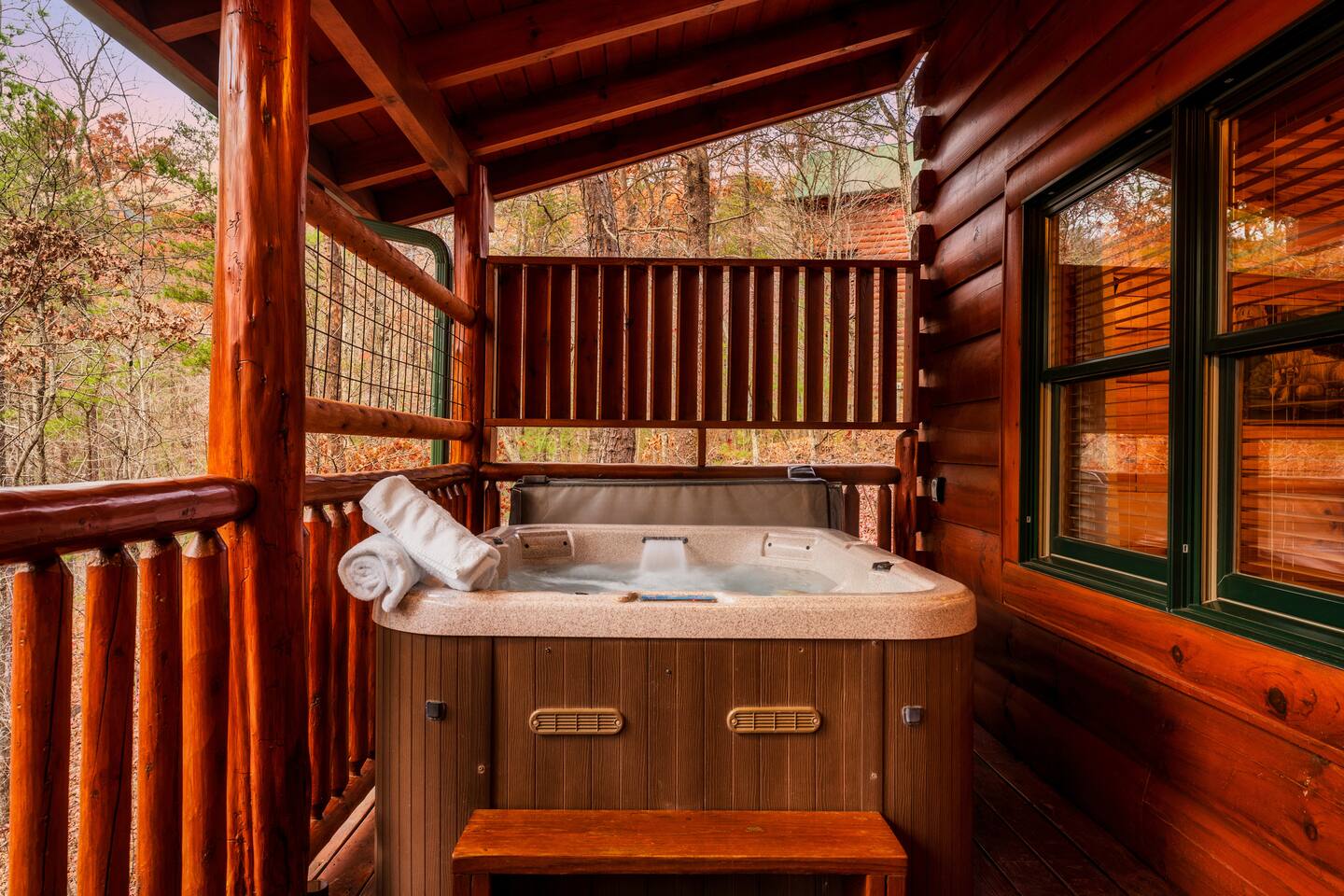LET US EXCEED YOUR EXPECTATIONS! -Only 9 miles to Dollywood -2 bedrooms (king, king) on main floor -Sleeps 6 (king, king, sleeper sofa, 2 futons) -2 full baths (main floor) -Washer and dryer in cabin -Resort Pool -Hot tub on private deck of cabin -Pool table -Foosball -Whiskey Barrel Arcade Game –Authentic Log Cabin -Cabin has smoke detectors, fire ext., carbon monoxide detector -Convenient location -Easy roads to access resort neighborhood and cabin -In a neighborhood yet feels very private